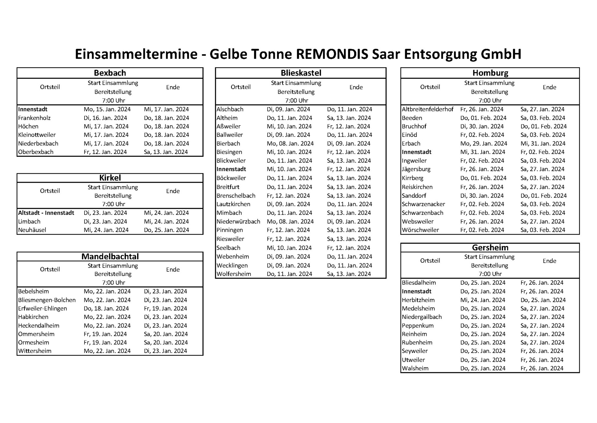 REMONDIS bittet daher alle Haushalte, die bisherigen Behälter nach der letzten Leerung im Dezember nicht mehr benutzen! Stellen Sie bitte Ihre bisherige(n) Gelbe(n) Tonne(n) zum Abholzeitraum (siehe Links am Textende) am Starttag um 7:00 Uhr vor Ihrem Grundstück bereit und lassen Sie den Behälter bis zur Abholung stehen. Die Tonnen müssen restentleert sein! Die alten Gelben Tonnen sind Eigentum der REMONDIS Saar Entsorgung GmbH, es besteht also eine Verpflichtung zur Rückgabe!